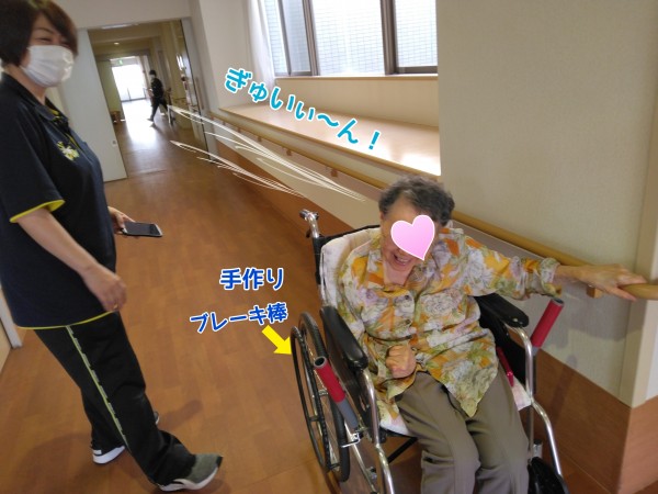 そして、ブレーキにはご家族様お手製の棒を装着!ブレーキの操作がしやすくなります。