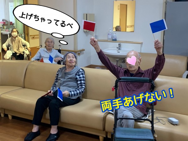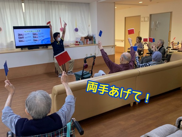 体操で居眠りがちな殿方も、思いっきり両手をあげるレクリエーション。