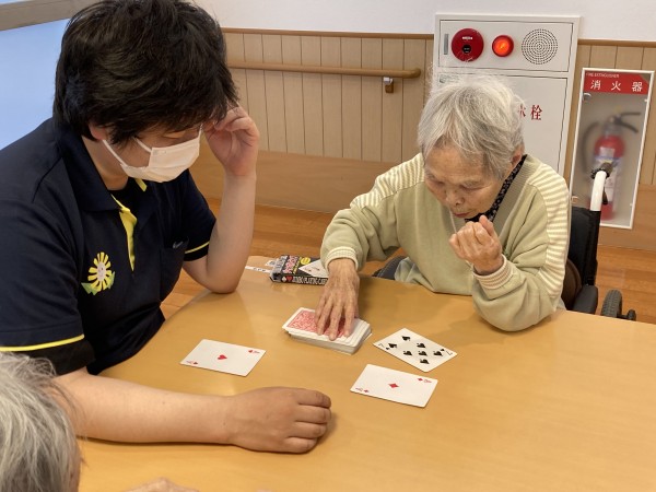 こちらは職員とともにトランプで簡単なゲームをしています。
