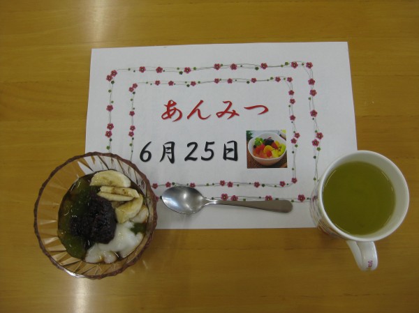 職員手作りのあんみつをおやつに提供しました!! 美味しい美味しいとペロリと完食されていました( ^ω^)・・・ 本当に美味しいよ、ありがとうね!!と大喜びでした!(^^)!