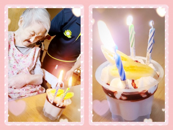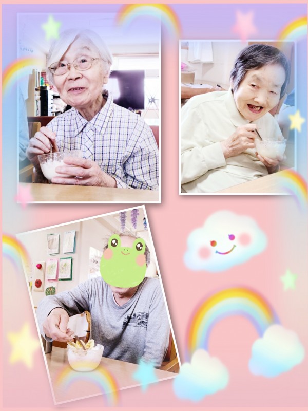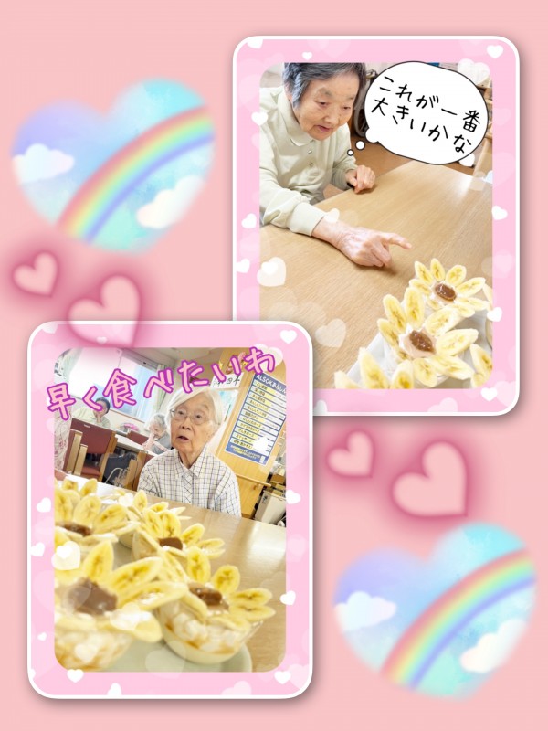 6月は2階N様の誕生日会です。誕生日当日にK職員がレアチーズケーキを作ってくれたのですが固まらず、翌日ホーム長が仕上げてバナナをトッピングして可愛いケーキを作ってくれました。
