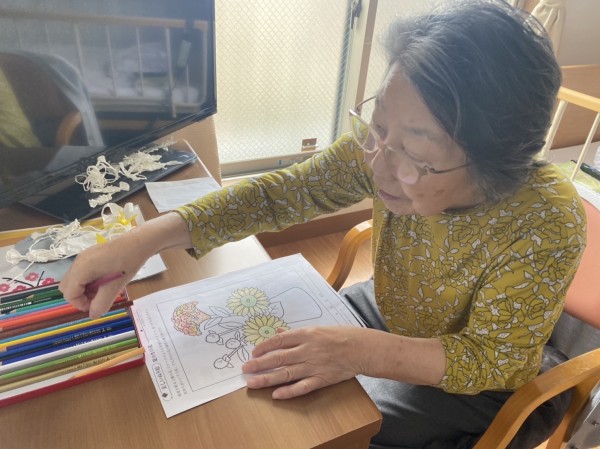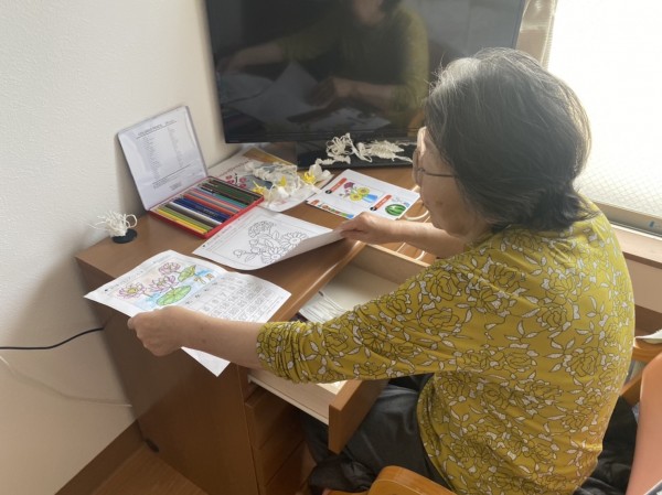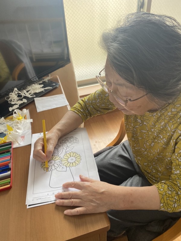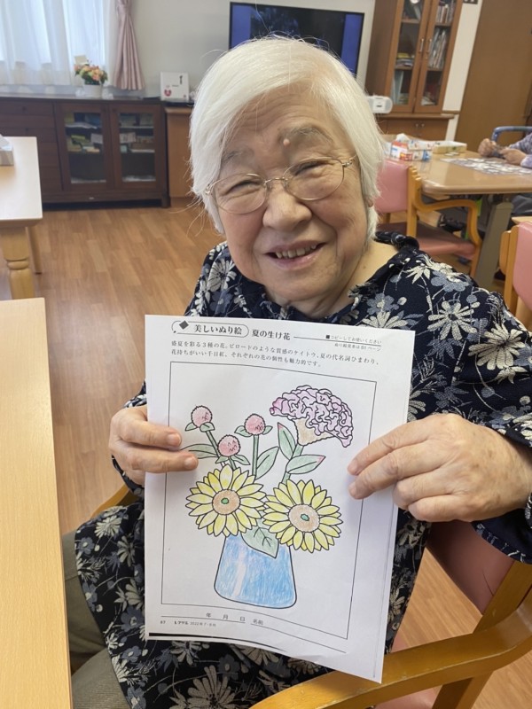 『7月のハスの塗り絵、完成したのよ♬向日葵は元気が出るから大好きは花♡』と笑顔で見せてくださるT様♡