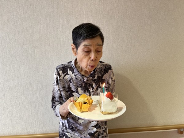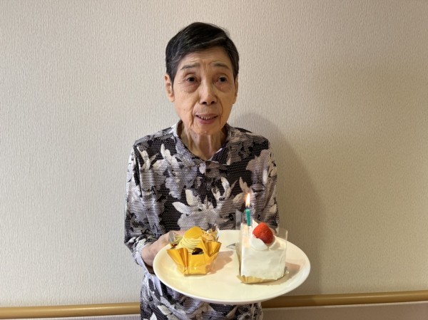 ご入居者様のご家族様の方から頂いたケーキとお洋服をもってお部屋にお邪魔させていただきました!