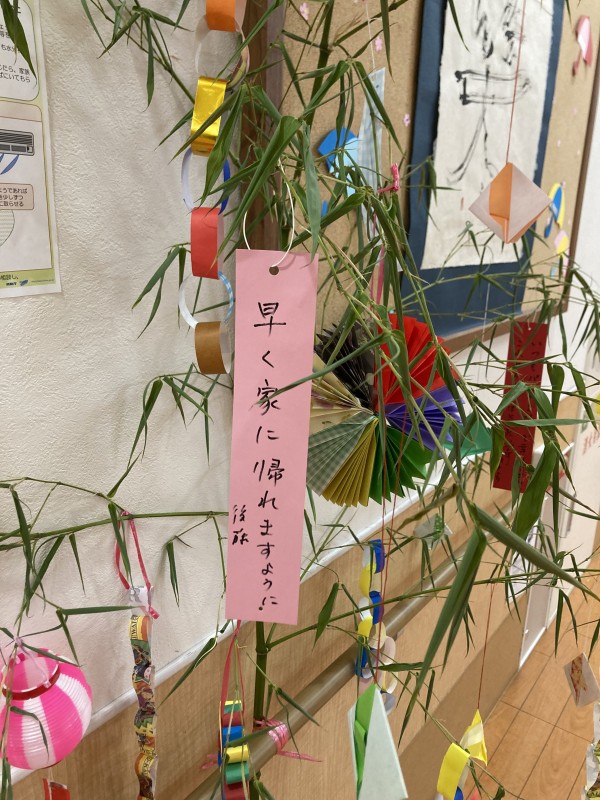 先日 七夕飾りを笹に飾り付けをして 今回は 入居者様に 短冊に願い事を書いてもらいました