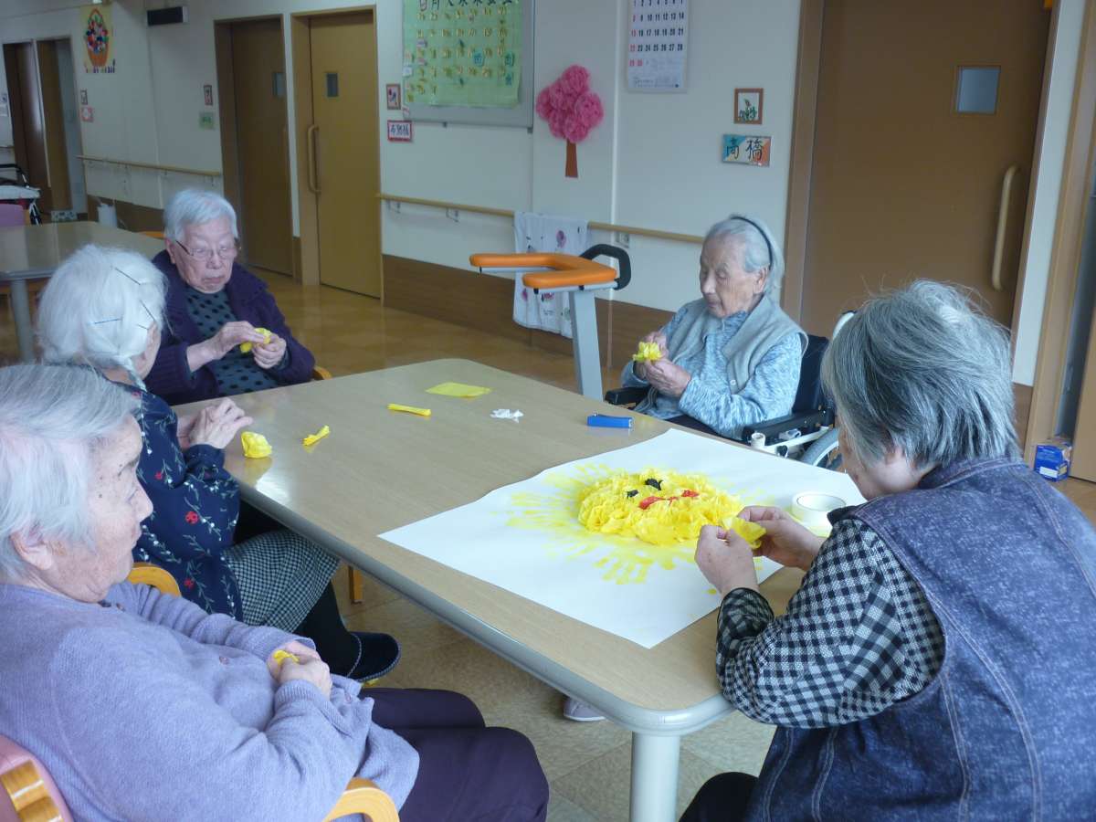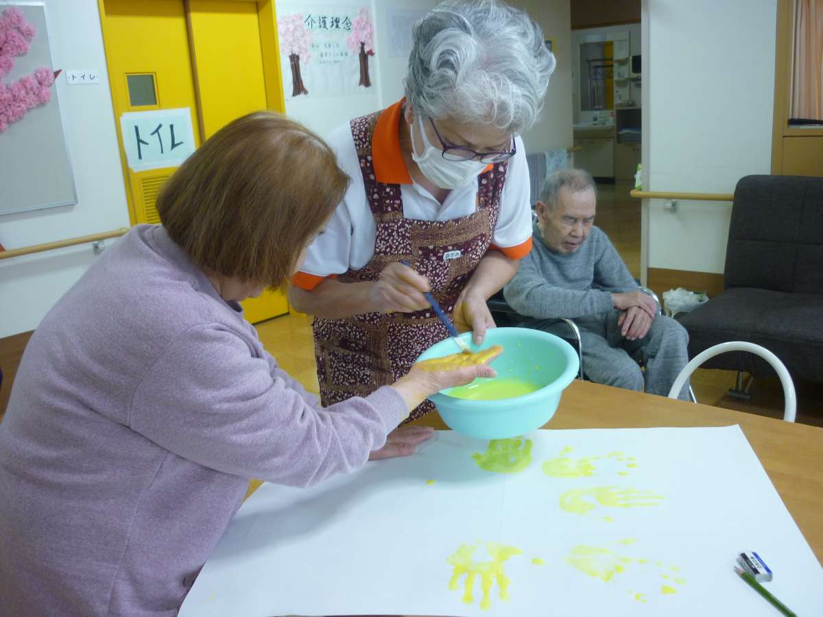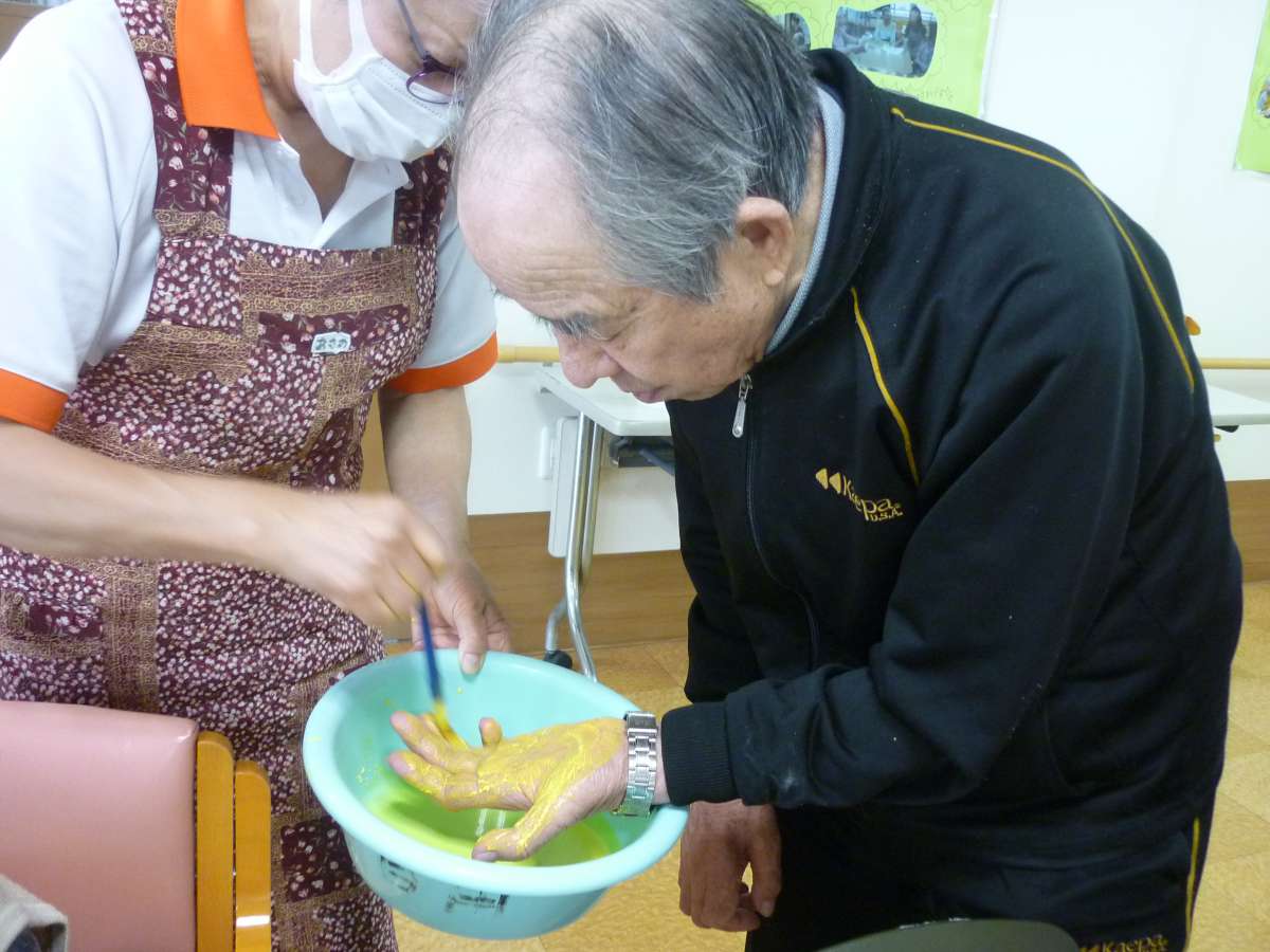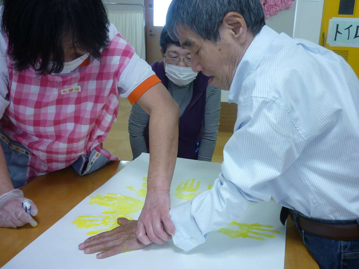 皆さん、黄色の絵具を手のひらに付けて、「えいっ!」と押しています。