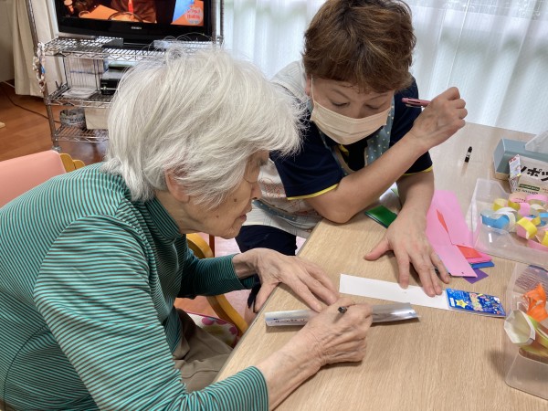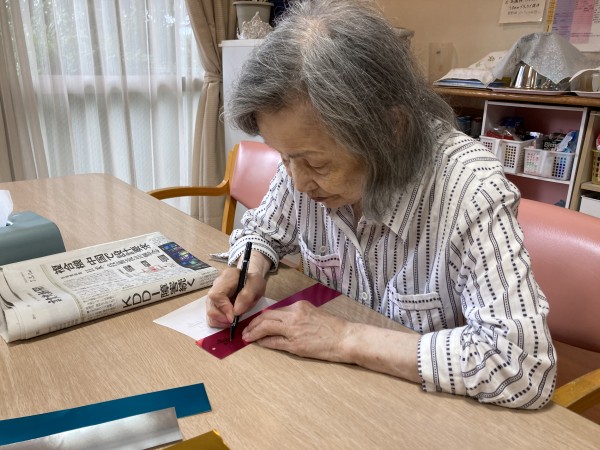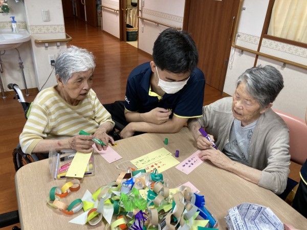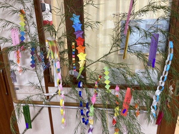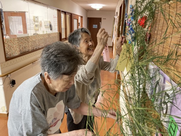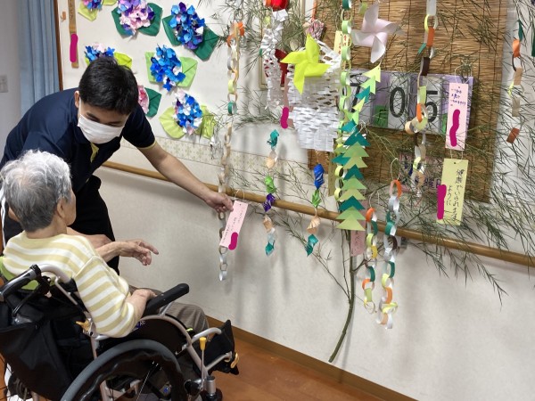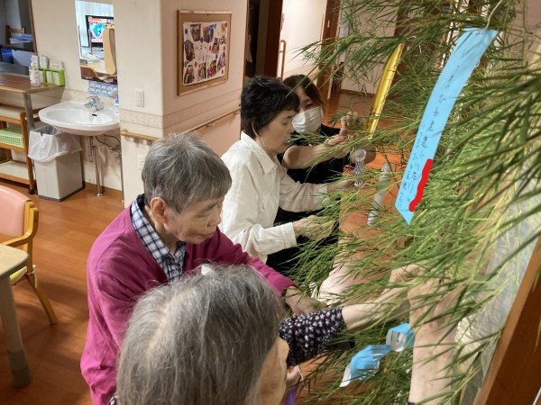 利用者様は「どこに飾ろうかな」「ここがいいかな?」と談笑しながらご自分の短冊を飾られていました。