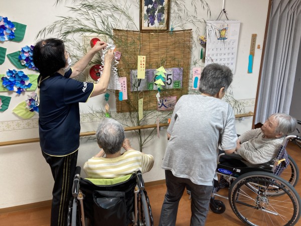 それぞれ飾りつけをして、車いすの方は職員が補助をし短冊も飾り終えました(*^^*)
