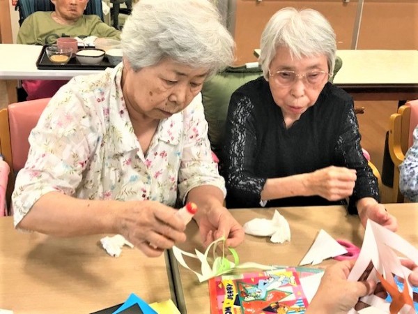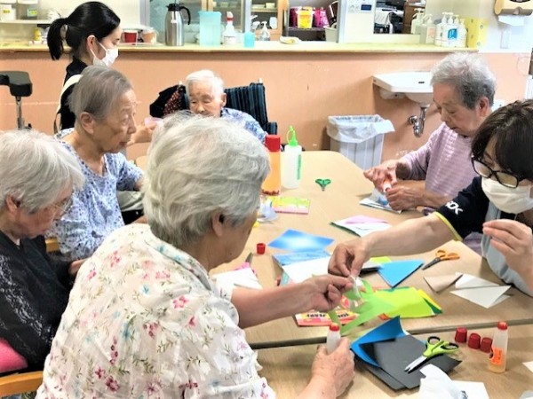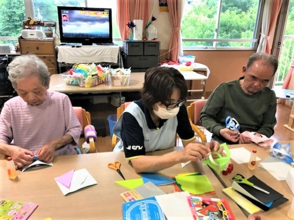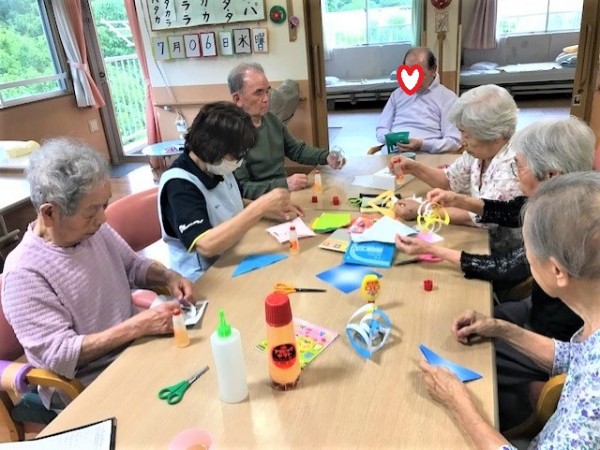 織姫様と彦星様が1年に1度会える日ですので、晴れる事を願いながら最後の追込みで七夕飾りを作りました。