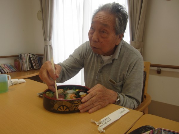 施設では、あまり食べれない特別にショートケーキと握り寿司が提供されました。