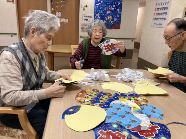 3階では、19日に行なわれる盆踊り大会(リモート)のうちわ作りを行いました。