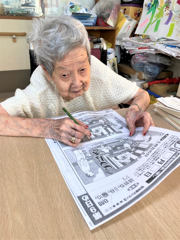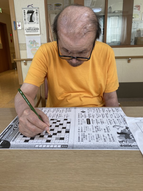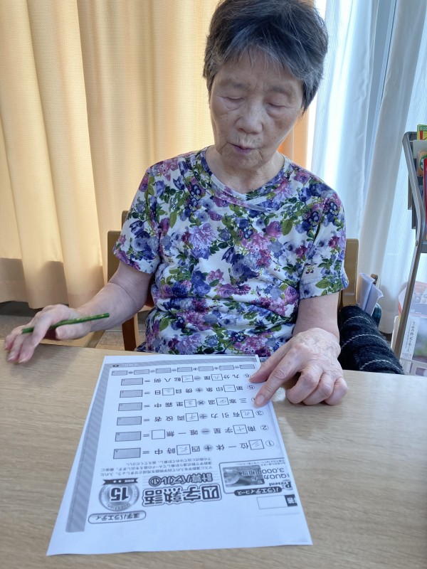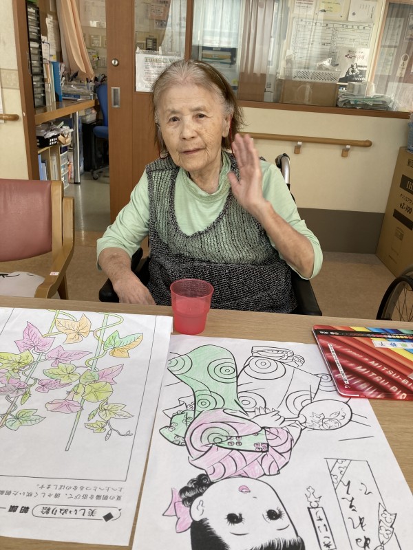 午前と午後の時間、“脳トレドリル”で頭の体操をしています。“塗り絵だって、刺激になるよね。” 夏題材の「祭うちわ」のちぎり絵も完成しましたよ。