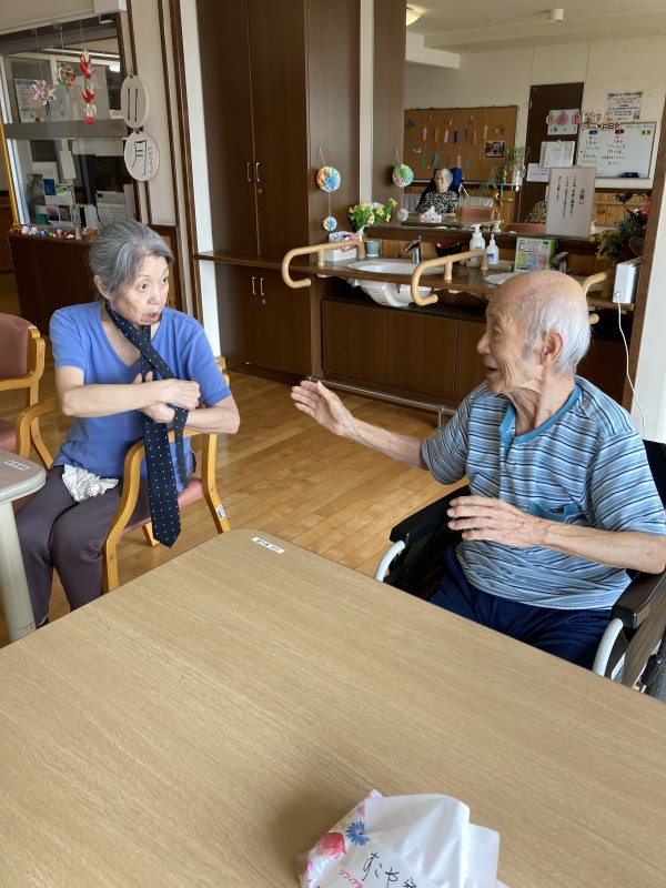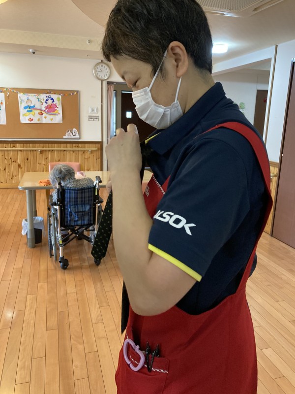 さて、男性入居者様に行っていただいたネクタイによるレクリエーション。