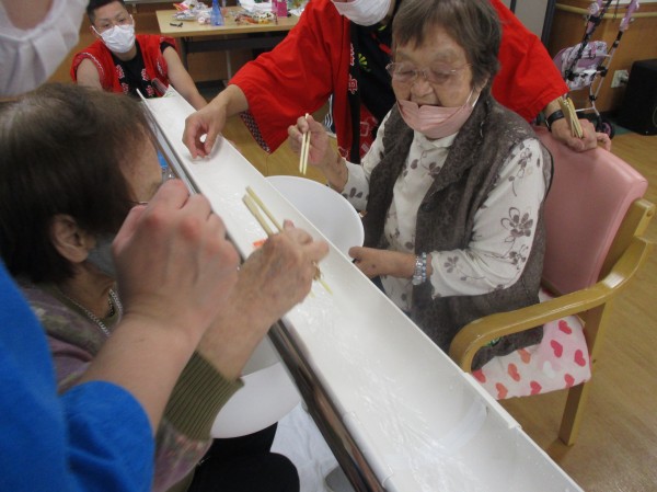 デイサービスセンター遊・志木上宗岡ではそうめんを流す代わりに、袋に入ったおやつを流し、四苦八苦してもらいながらすくっていただきました(^^)/