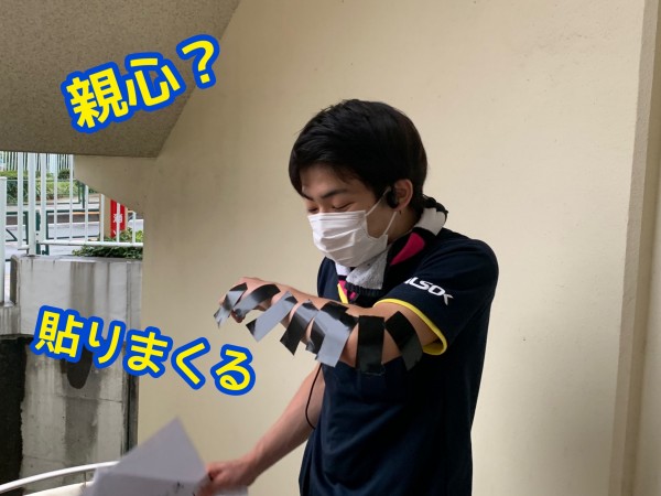 「テープごと渡せばいいんですよ」と髙村くんに言われながら、小西くんにペタペタ貼るのは親心?