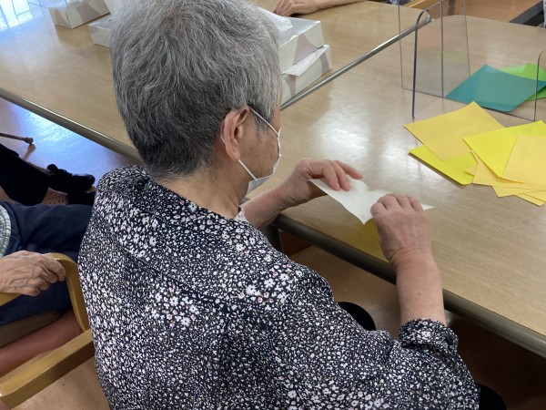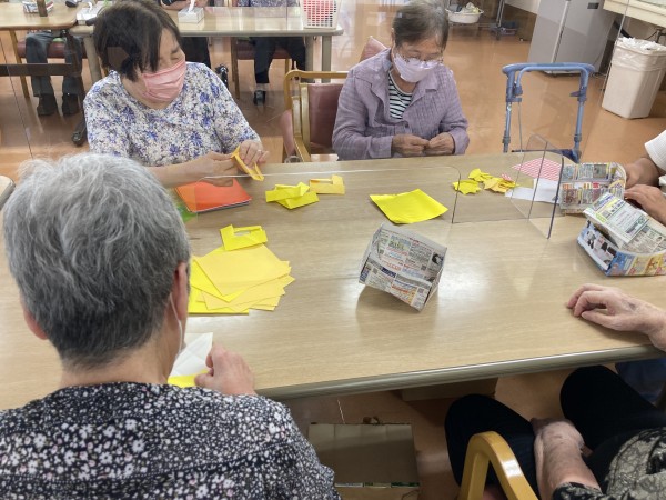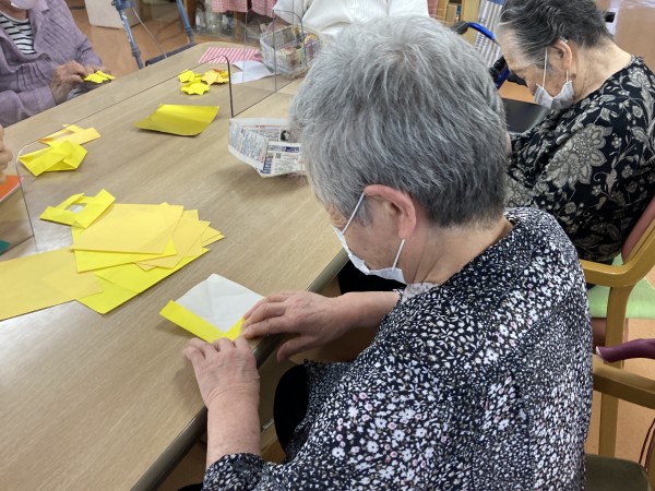 折り紙を折って作っているのは・・・「向日葵」になります!リアルなお花もいいですけど、作ったお花もまた一手間かけて作ったと実感がわきますからね~