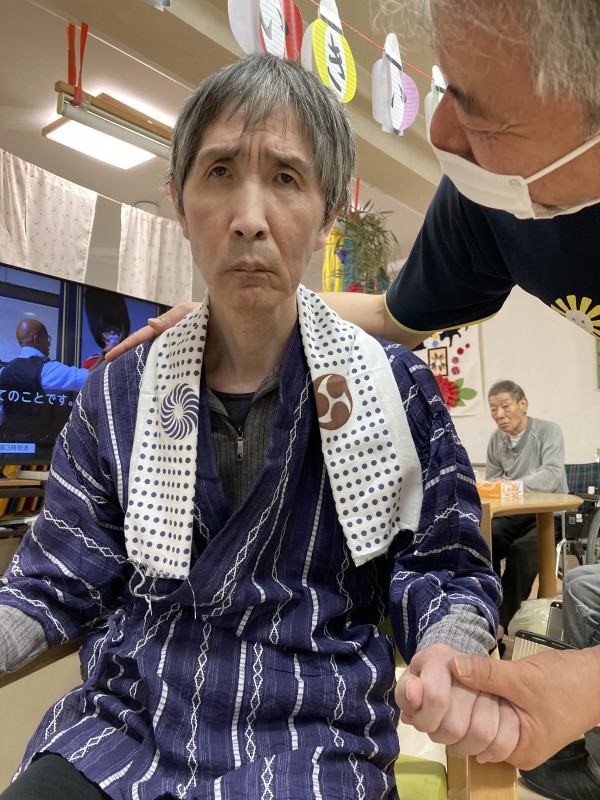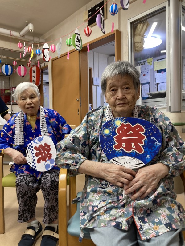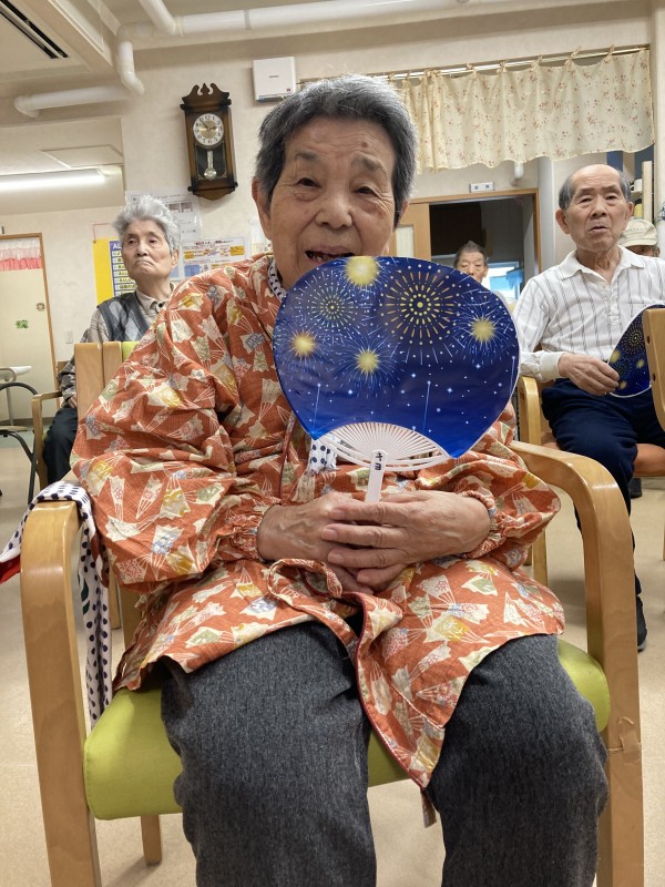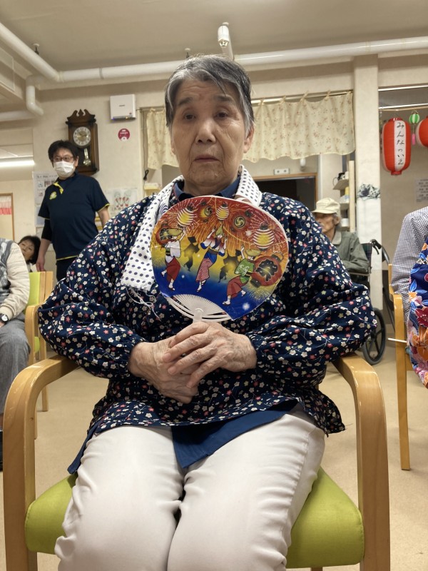 2階の皆様は、盆踊りと聞いて、甚平を着て、ねじりハチマキにうちわをもってやる気満々です。