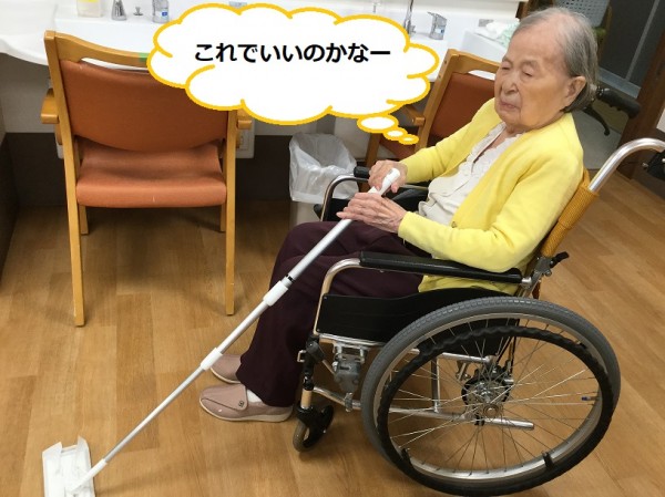 フロアをクイックルワイパーで綺麗に掃除中のT様。