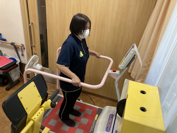 また、マシーン以外にも平行棒を使用した歩行練習、踏み台で階段の昇降をイメージした訓練があります。これにも下肢に重りを付けて訓練される方もいらっしゃいます。それ以外にも、機能訓練指導員によって拘縮した部分を柔らかくするために可動域を伸ばす訓練などもあります。