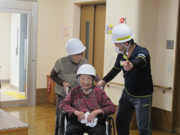 内容:夜勤者のみの時間に1階厨房より出火の想定。消防への通報(の訓練)。入居者を安全な場所への誘導を行う。近隣や本部への連絡を行う。消火器の位置確認と使用の方法の確認を行う。