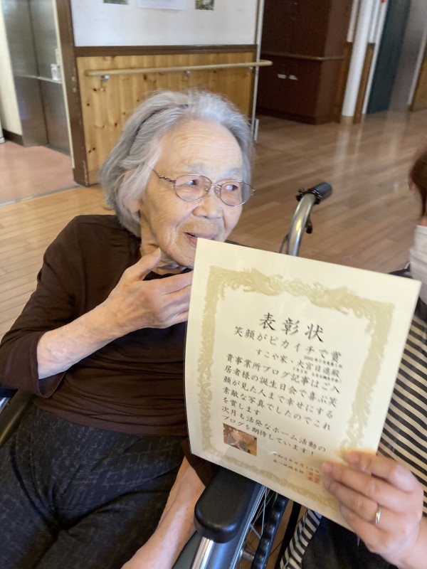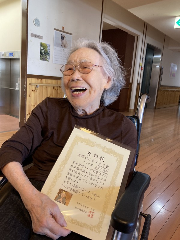 2022年7月3日掲載の「6月お誕生日会!」のご入居者様の笑顔が、閲覧してくださった方のハートを