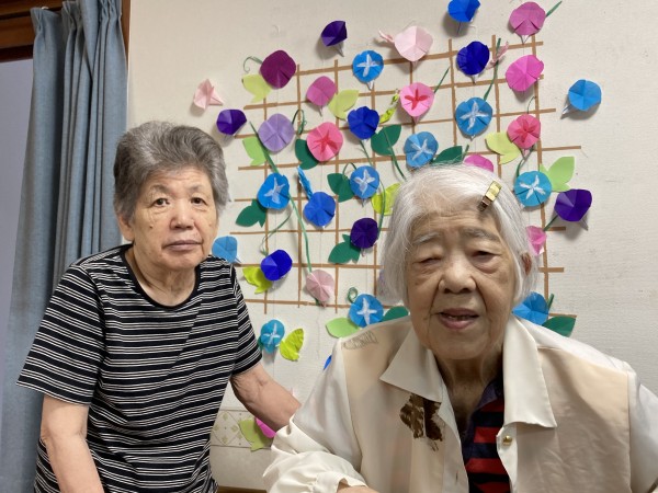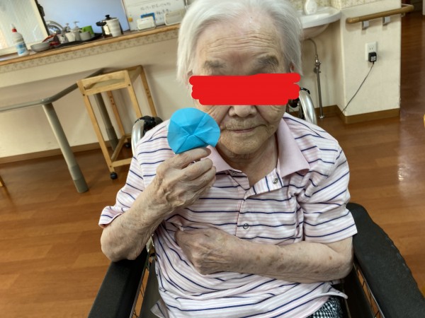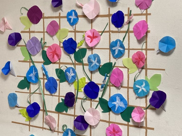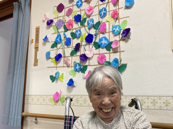 職員と利用者様、一緒に折り紙で「アサガオ」を製作しました。