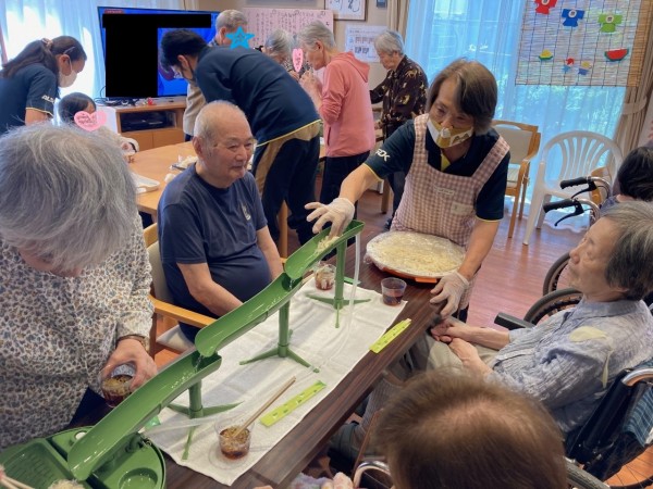 スタッフが上流から水とそうめんを流し、皆様がタイミング合わせて