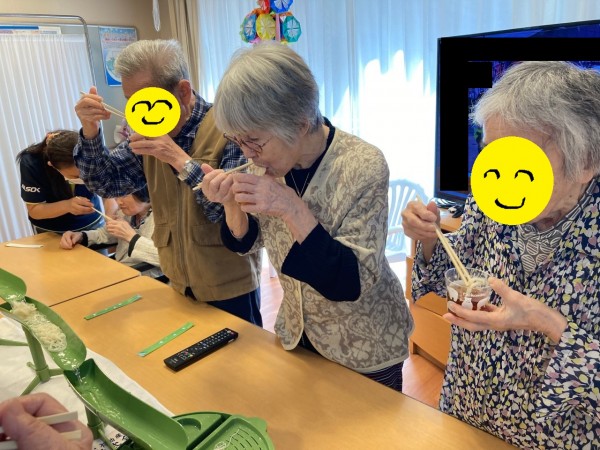 みなさま、流れてくる、そうめんに真剣です。
