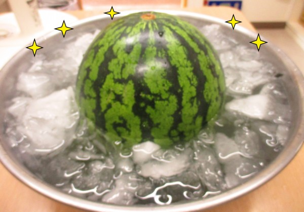 職員が、ねじりハチマキをして、大きなスイカを切っていきます!