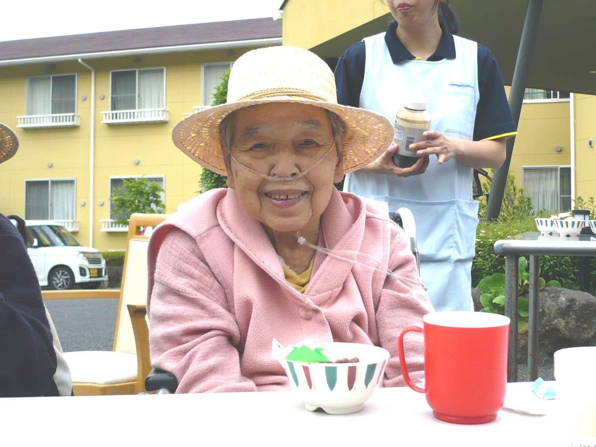 施設入口に飾ってある小さな兜を、男性入居者様にかぶって頂いたところ、