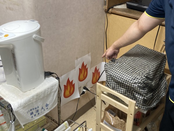 明け方に1階厨房のコンセント付近から出火したと想定し、夜勤者3名で打ち合わせ。