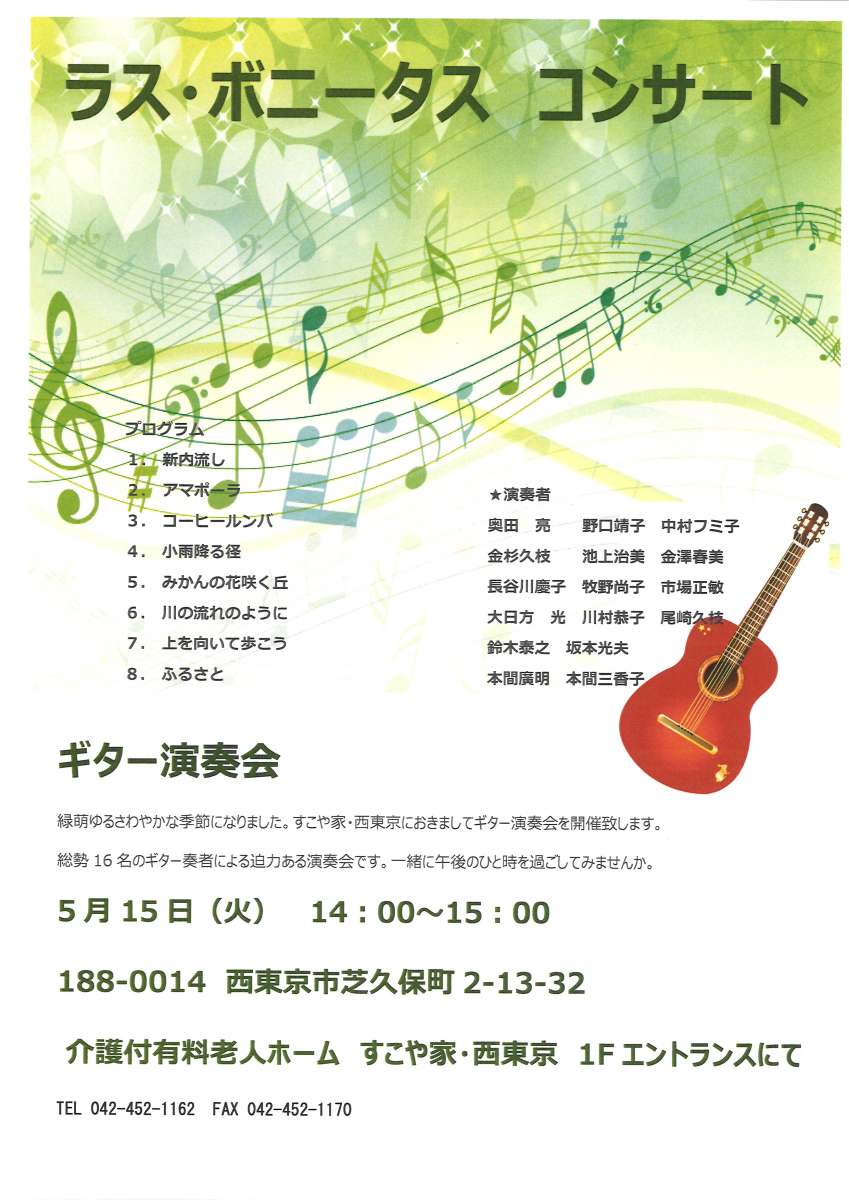 5月15日(火) 14:00~ 介護付有料老人ホーム すこや家・西東京 「ギター演奏会」を開催します。 総勢16名のギター奏者による迫力ある演奏会です。一緒に午後のひと時を過ごしてみませんか。