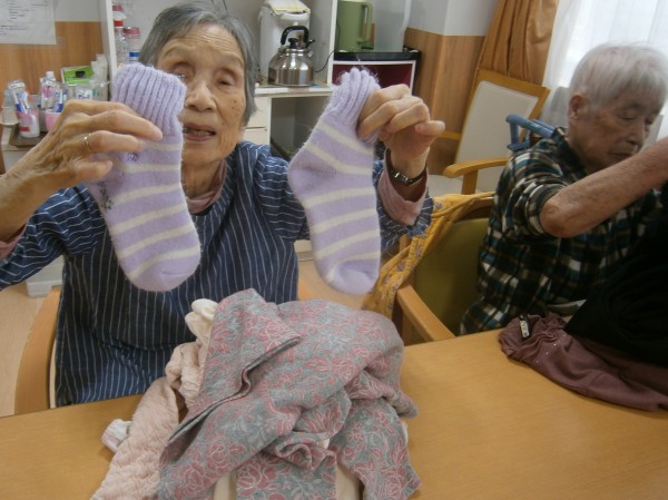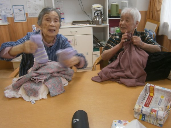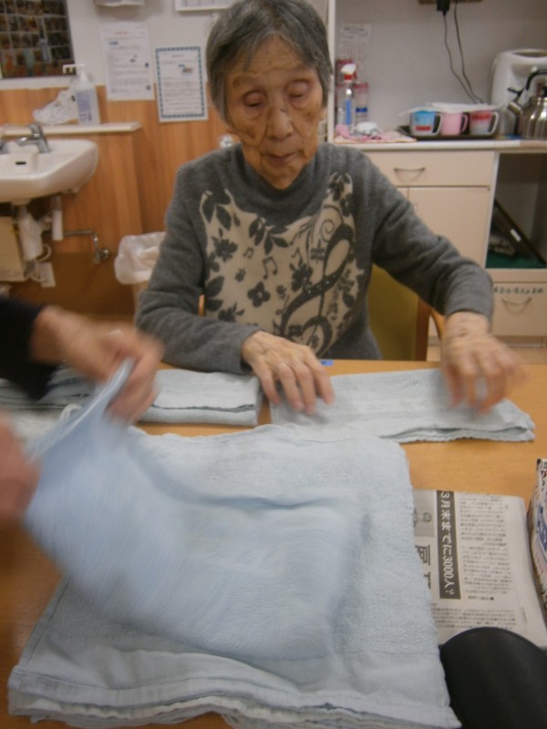 毎日毎日、、体操・脳トレに加えお手伝いもされます。 嫌な顔など微塵もなくそれどころか楽しそうに役割分担されながら「あーすればいいのよ、貴方上手ねー、昔はもっとテキパキ出来たのにねー」なんておしゃべりに花咲かせながら実に楽しそうにされます。職員も本当に助かってます(*'▽')。それどころか職員より丁寧に綺麗に畳まれます。さすが先輩(; ・`д・´)