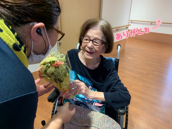 お部屋から出て来たご入居者様に花束をプレゼントします。