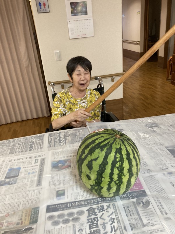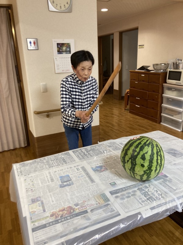 棒を振り飾り、「えい!」と気合を込めて取り組んでたり、「スイカが可哀そう・・」と叩いた後に撫でたりと様々でした。