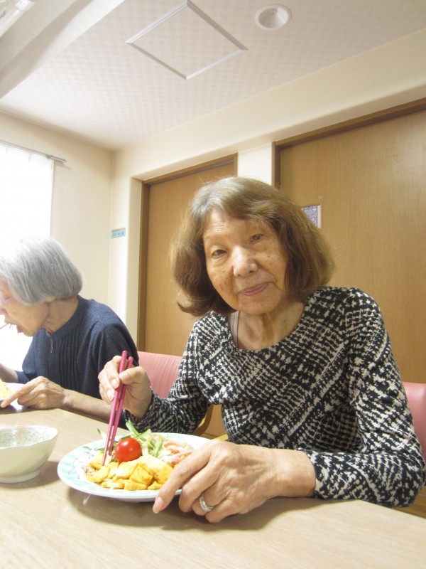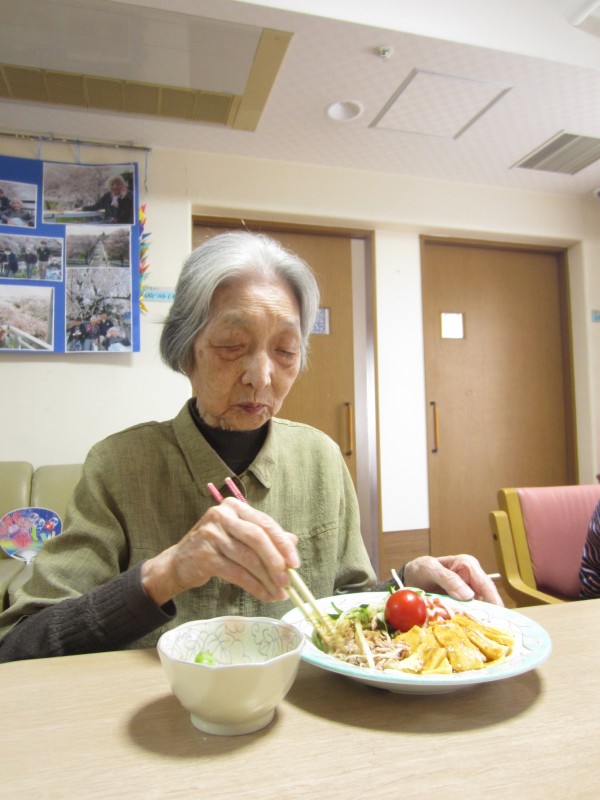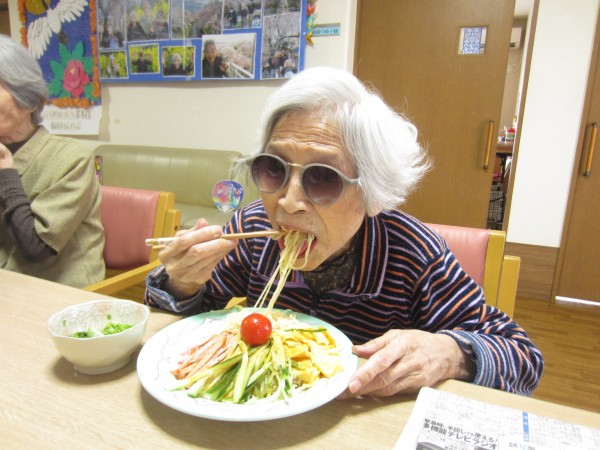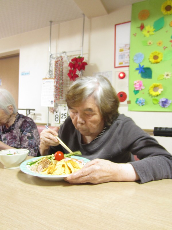 ご利用者様に「この玉子は甘くて美味しいですね。このソーセージも柔らかくて美味しいですね。」と仰っておられて、とても笑顔で真剣に召し上がっておられました。ご利用者様は「私は麺が大好きです。」と仰っていたので冷やし中華を作って良かった思いました。