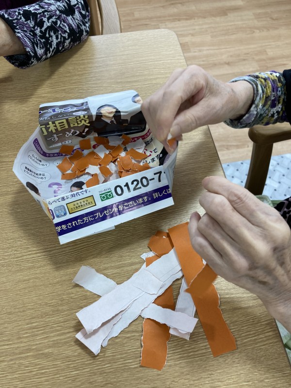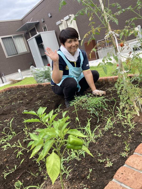 8月もあと僅か。寒さ暑さも彼岸までと言います。暑いのも後少しの辛抱ですね!まもなく実りの秋がやってきます(^-^) 「実りの秋と言ったら?何でしょうね〜?」小さな声で、、、饅頭??って聞こえてきました〜⁉️(๑˃̵ᴗ˂̵)それもおいしそうですね。そう。秋は柿、みかん、栗、カボチャ、キノコ、サツマイモ〜たくさんありますね♪9月の壁飾りは柿に決定~(^.^)!折り紙で柿を作りました。「柿に見えないよ?!トマトじゃないの?」なんて声が聞こえてきます(^.^)でも柿なんです(^。^)木の部分はちぎり絵です。皆さん細かくするのが上手い!秋の実りや味覚って聞いただけでもワクワクしますね♪♪出来上がりが楽しみです!ホームの畑もほんの少しだけどミニトマト、ピーマン、オクラが育ちました〜(^o^)!草むしりも頑張りました♪バッタがいたりコウロギも鳴いていました♪間もなく秋です(^-^)