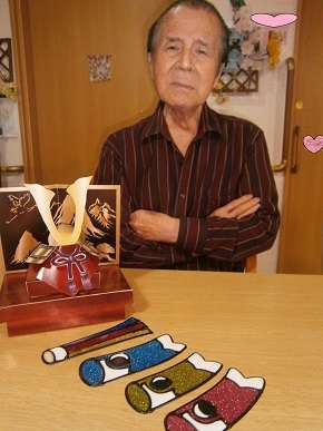 兜をかぶったり、可愛い鯉のぼりを写真撮影。「兜?あはは、子供の日か!」「あら、これ兜なの?すごいわね~」「なつかしいねぇ~」「可愛い鯉のぼりね」等、紙で作った兜に驚かれたり、可愛い鯉のぼりを見ながら笑顔ですごされました。