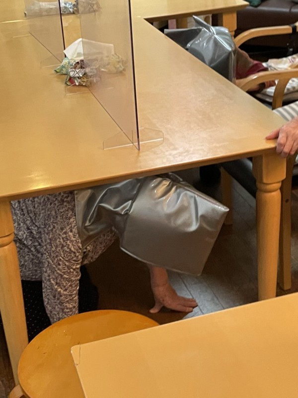 揺れがきたら、まず机の下にもぐって頭を守る。