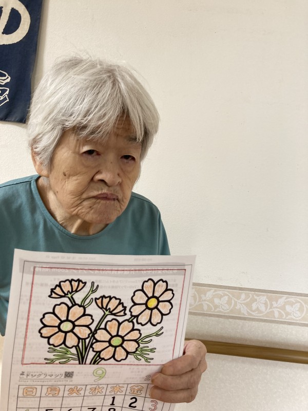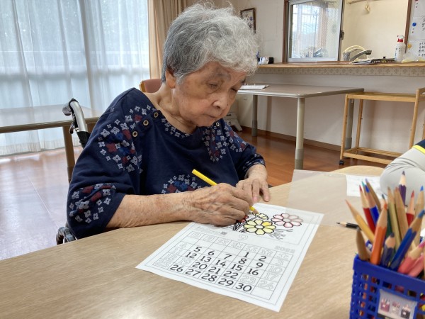 「どんな色がいいかな?」「コスモスってどんな色があったかしら?」と悩みながら、隣の利用者様が色塗りをしている様子を見て色を選んだり同じ色にしたり…