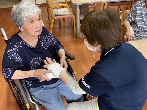 利用者様が使用している包帯を洗濯し、使いやすいように巻いていると利用者様が「手伝うわよ」と言って下さり手伝って頂きました!