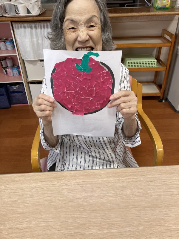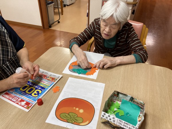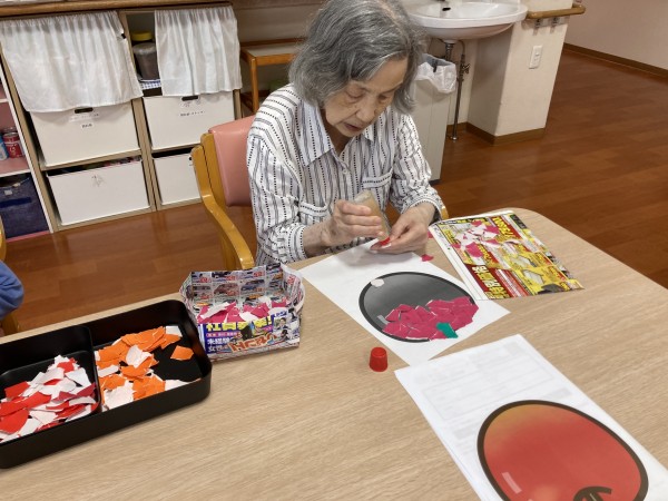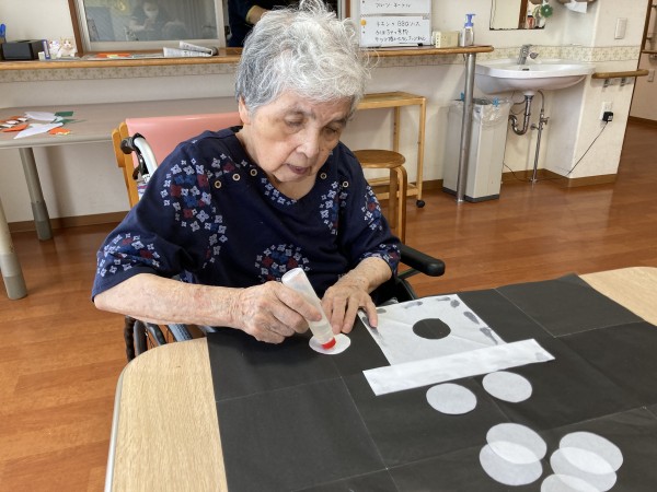 「これはどの辺にすればいいかな?」「この辺でいいかしら」と不安そうに聞きながら貼り付けされ、職員も常に側にいるので「この辺かな?」など話しながら安心できるように声をかけながら見守りをしています(*^^*)