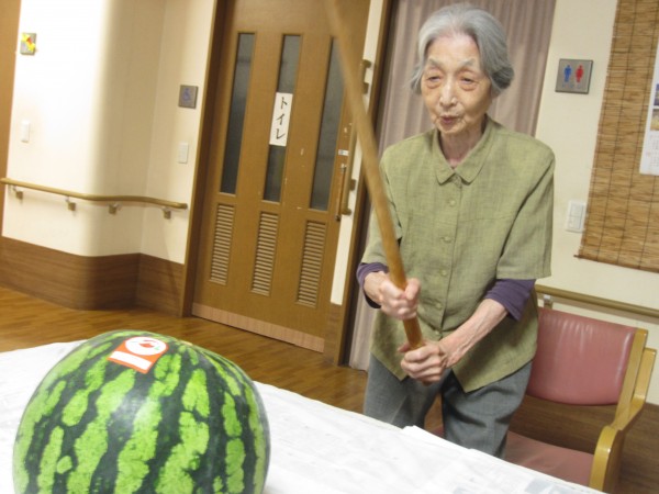 「いっせの!」と皆様は声に出して一生懸命にスイカを割られました。