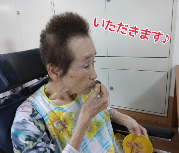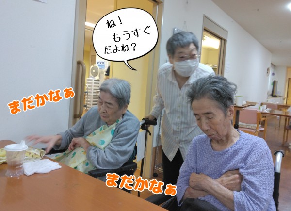 ご入居者様同士、声を掛け合いながらペコペコのお腹を抱えて