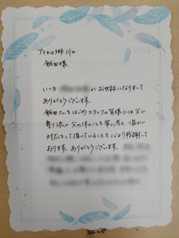 お言葉を伝えて下さったご家族様のお心遣いに感謝いたします。