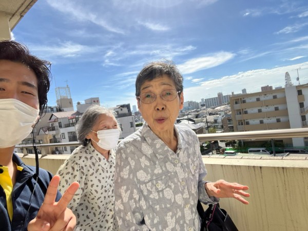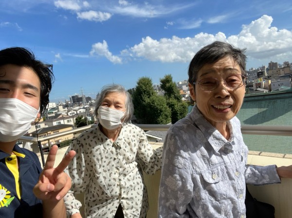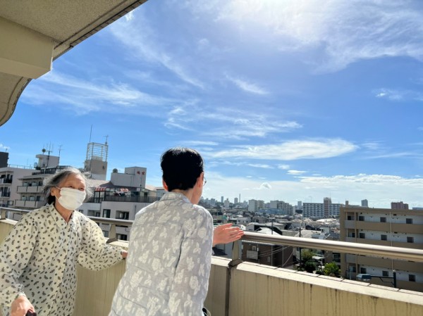 ベランダから、お部屋で過ごすご入居者様を見つけて「おぉ〜〜い!」