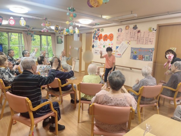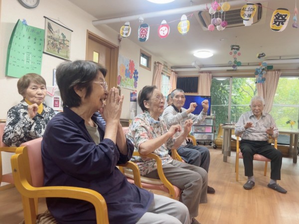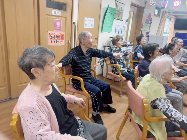 いきいきリズム体操では、体を動かすことはもちろん、先生とご利用者様とケアスタッフ、全員で楽しく、笑顔で参加しております。