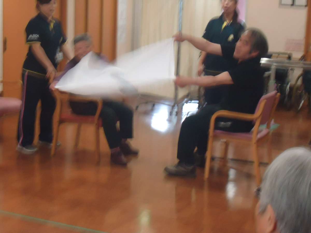 2人1組でバスタオルの両端を持って玉を遠くに飛ばす