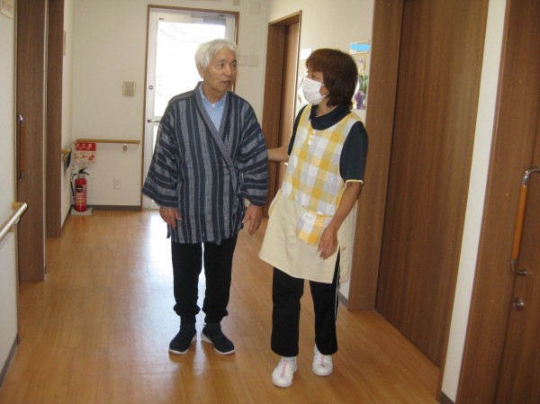 職員と一緒に楽しそうに歩かれていました。笑顔が素敵ですね( ^ω^)・・・ 筋力維持にもなっていますね!!