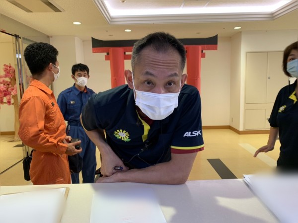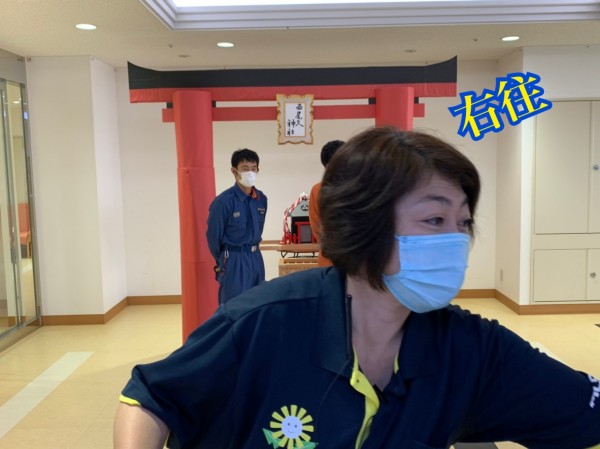 朝礼スタンバイ中の光ケアスタッフの後ろに見えるのは