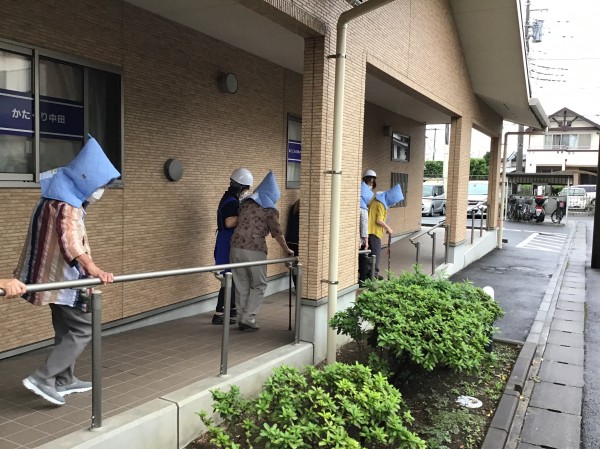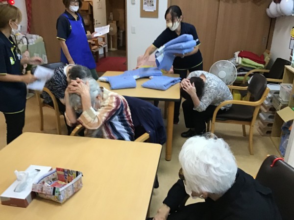 揺れが収まったこと、利用者様の安全を確認したら利用者様に防災ずきんを配って着帽していただきます。スタッフも全員ヘルメットを着帽します。